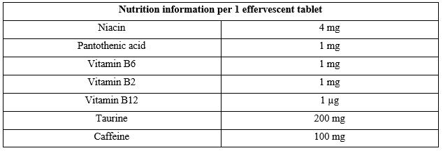 حاوی کافئین، نیاسین، تائورین و ویتامین های B2، B5، B6 و B12