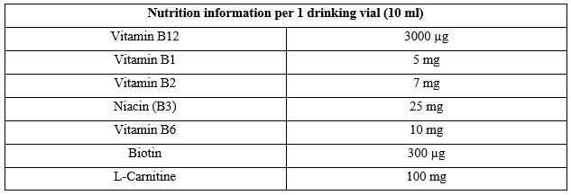 حاوی ویتامین B12 (3000 میکروگرم)، ال-کارنیتین و ویتامینهای B1، B2، B3، B6 و بیوتین