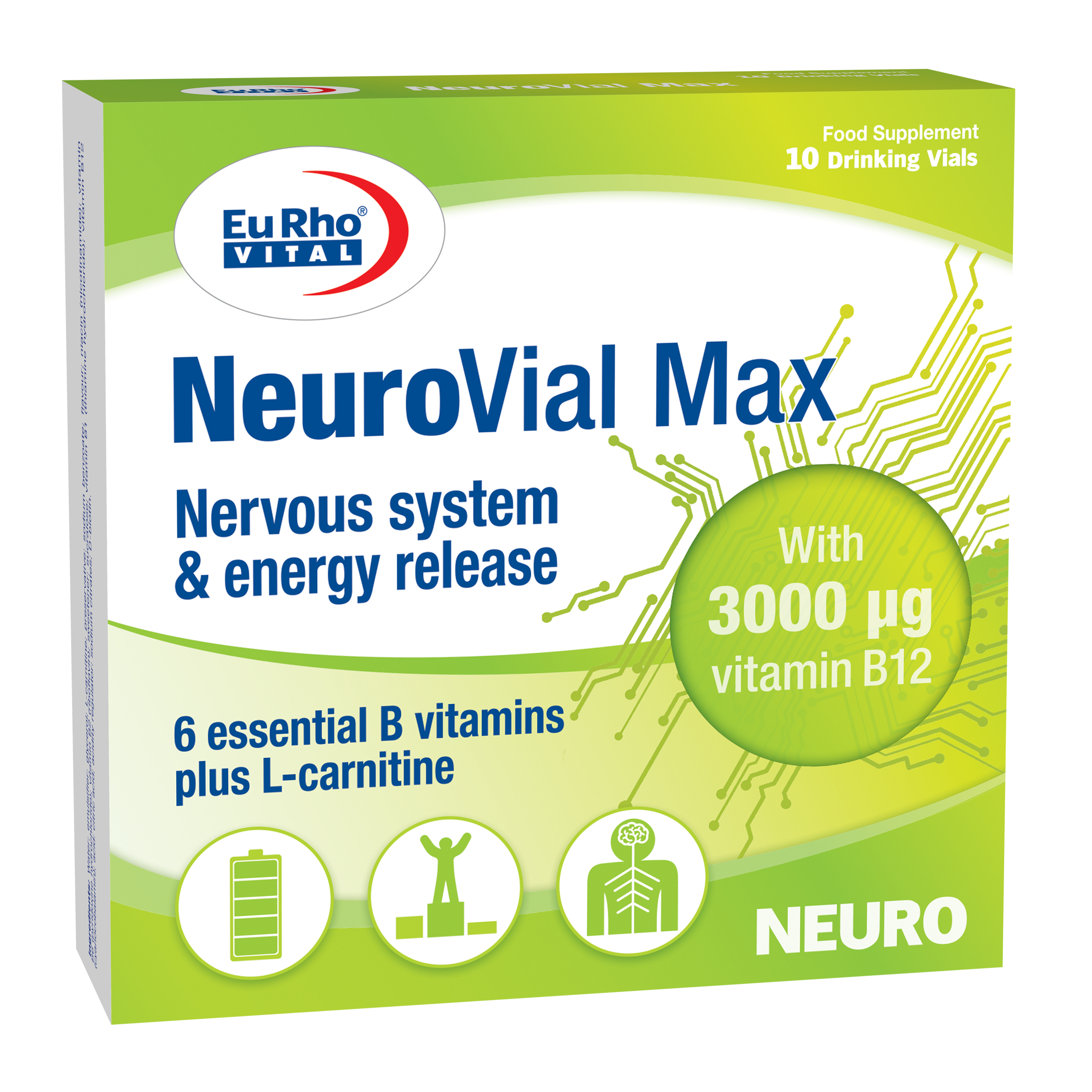 ویال خوراکی نوروویال مکس یووریتال حاوی 3000 میکروگرم ویتامین B12 بههمراه ال-کارنیتین و ویتامینهای B1، B2، B3، B6 و بیوتین است که به جبران کمبود این ریز مغذیها و بهبود عملکرد سیستم عصبی کمک میکند.