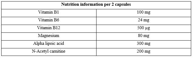 حاوی ان-استیل کارنیتین، آلفا لیپوئیک اسید، منیزیم و ویتامینهای B1، B12 و B6
